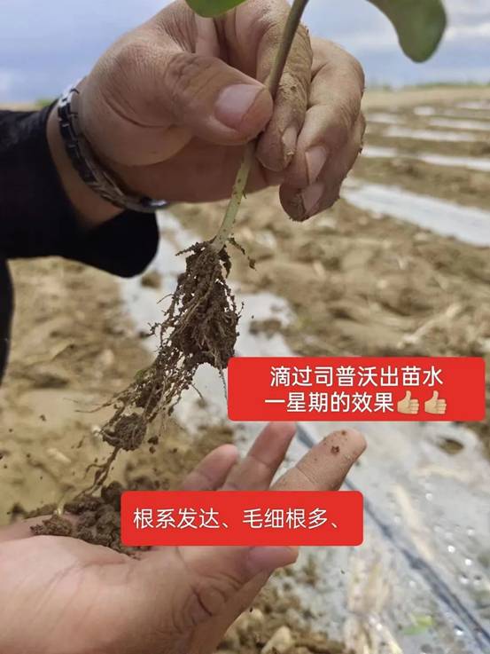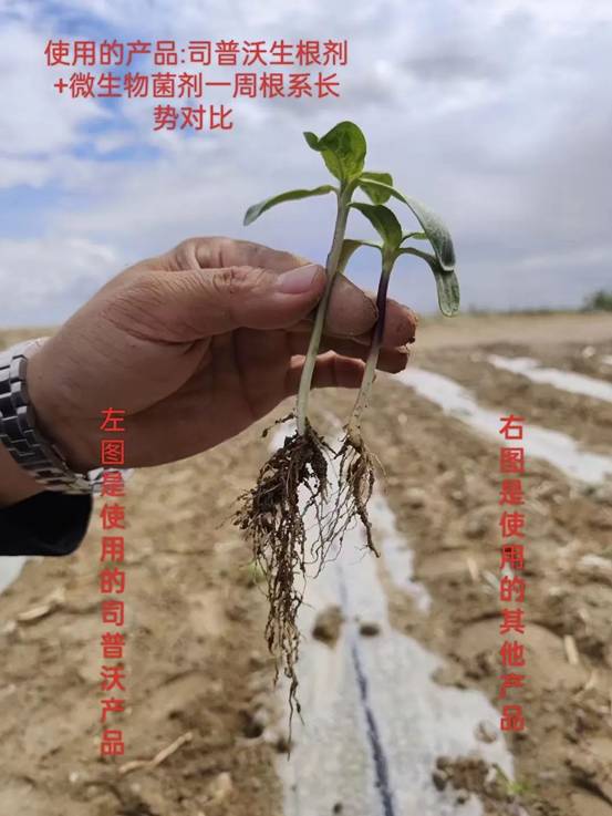 新疆葵花沖施司普沃“三活三抗”套餐,根系發達健壯,毛細根多,根多根壯,植株長勢健壯,而使用其他產品,根系相對少,植株相對較瘦弱,對比明顯。